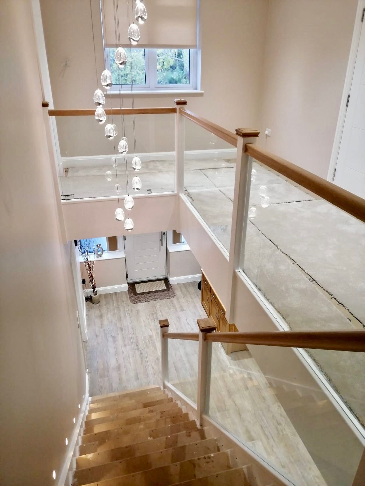 This project features clear glass panels paired with a solid oak handrail, creating a light and open feel across the landing while maintaining safety. The natural oak finish adds warmth and contrast against the white walls, making this a simple, timeless upgrade within the home.